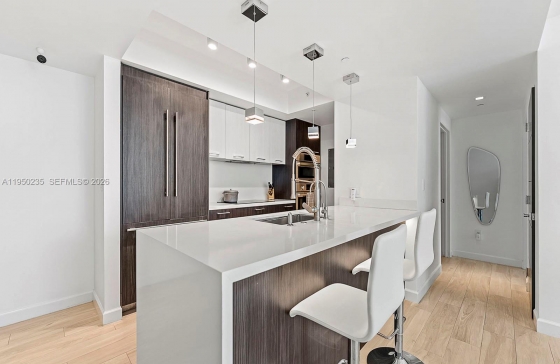 500 Brickell Ave #2203, Miami, FL, 33131 $75,000 in Upgrades. Turnkey luxury,designer-remodeled 1-Bedroom in 500 Brickell East/ NO ASSESSMENTS. Every detail of this home has been meticulously upgraded with premium finishes. Blonde wood-look porcelain tiles runs throughout and carry into the oversized balcony. The open concept living space is elevated with WAC recessed lighting, dropped ceiling cove lighting, and direct LED fixtures. A full size Samsung front load washer and dryer. The spa-inspired bathroom, with marble-style wall finishes, all new plumbing, separate tub and shower w/ body jets, plus ceiling mounted tub filler. The bedroom features an elegant accent wallpapered wall and Lutron Smart lighting, fully controlled from the phone. Set in the heart of Brickell, steps from fine dining, entertainment, and transportation.