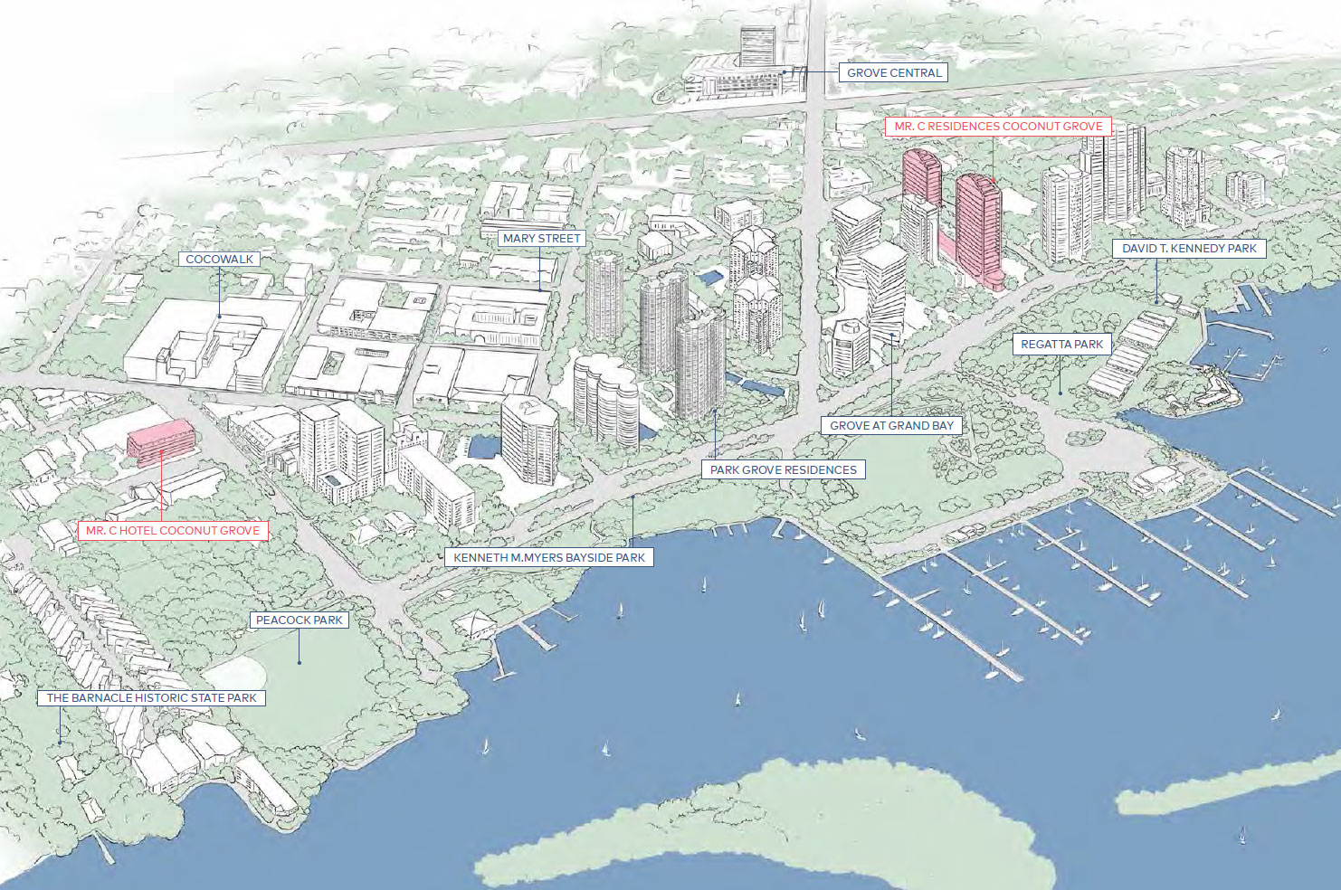 Located on South Bayshore Drive, Mr. C Residences features panoramic views spanning from Peacock Park across Biscayne Bay to Key Biscayne and beyond.