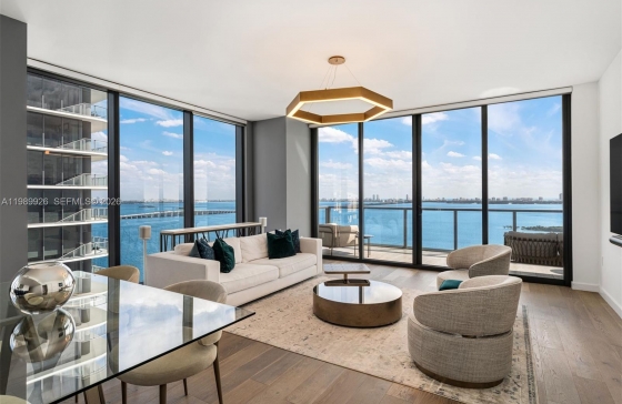 788 NE 23rd St #2302, Miami, FL, 33137 Set within Edgewater’s premier boutique tower of just 94 residences, Elysee Miami, Residence 2302 offers a flow-through layout with 3 bedrooms + den/media room (optional fourth bedroom) and 4.5 baths. Interiors are thoughtfully curated with custom finishes, oak wood flooring, and a gourmet kitchen featuring quartzite surfaces, Wolf and Sub-Zero appliances, and wine storage. The primary suite and living areas overlook Biscayne Bay with stunning sunrise views, while the west-facing terrace captures city and sunset vistas. The spa-inspired bath features Waterworks fixtures, dual vanities, a soaking tub, and glass-enclosed shower. Designed by Jean-Louis Deniot, Elysee offers resort-style amenities, fitness center, spa, and white-glove services.