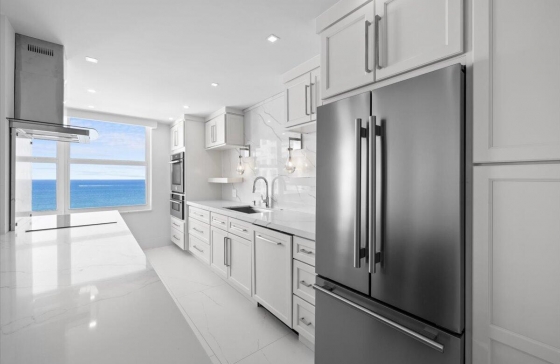 4300 N Ocean Dr #15d, Fort Lauderdale, FL, 33308 Welcome to Residence 15D at the prestigious Plaza East on Fort Lauderdale`s Famous Galt Ocean Mile. This fully renovated 2-bedroom, 2-bathroom oceanfront residence offers breathtaking, unobstructed views of the Atlantic Ocean and Intracoastal Waterway from the 15th floor. Thoughtfully designed with high-end finishes and custom features throughout, this home combines modern coastal elegance with luxury living.The open-concept kitchen is a showstopper, featuring custom white shaker cabinetry, premium Forno European-designed stainless steel appliances, quartz countertops, and a stunning waterfall-edge peninsula ideal for entertaining.