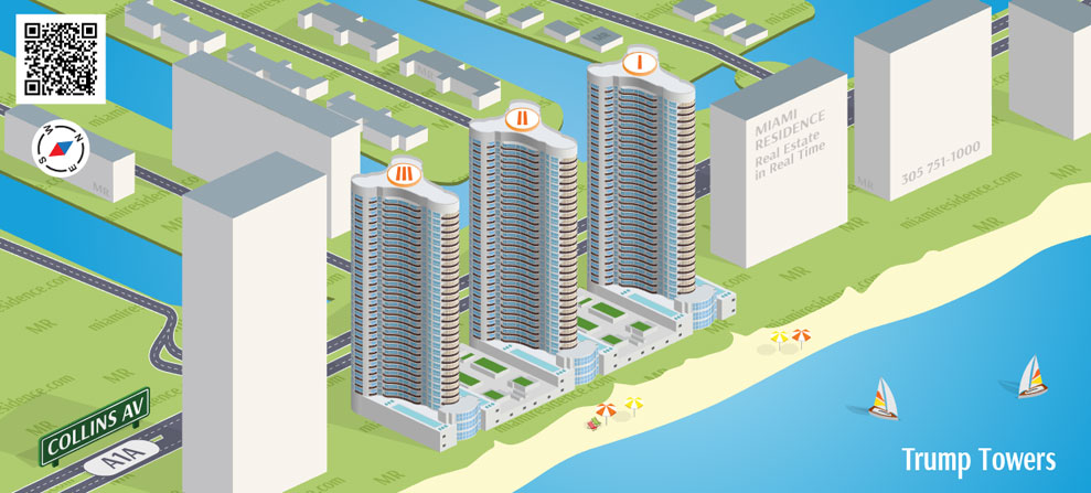 Trump Towers, a three phase development on the beach, is located on the northern tip of Miami Beach in the city of Sunny Isles Beach.