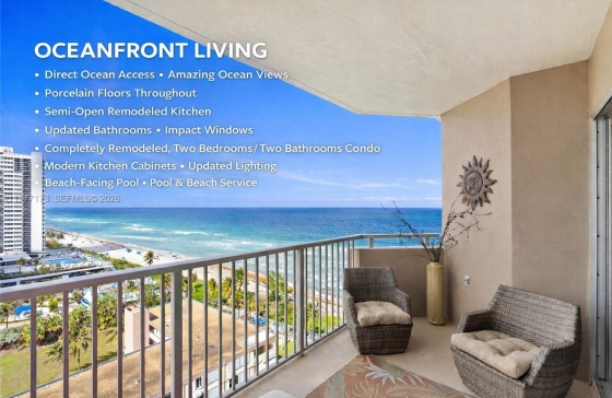 1950 S Ocean Dr #12H, Hallandale Beach, FL, 33009 Experience the pinnacle of oceanfront living. Wake up to breathtaking views of the Atlantic from every room and walk straight onto the sand with private beach access and personalized beach service at your fingertips. Enjoy morning coffee as the sun rises over the waves, then spend your day relaxing by the resort-style pool, working out in the state-of-the-art fitness center, or indulging in a spa treatment just steps away. Inside, this completely remodeled condo is designed for both elegance and comfort. Porcelain floors flow seamlessly throughout, complementing a modern semi-open kitchen crafted for effortless cooking and entertaining. Bedrooms and bathrooms are oriented to capture the serene water views, creating a peaceful retreat. The new balcony and impact windows bring in sea breezes while offering ultimate security and peace of mind. Every detail has been meticulously curated—this is more than a home; it’s a lifestyle defined by sun, sea, and serenity.